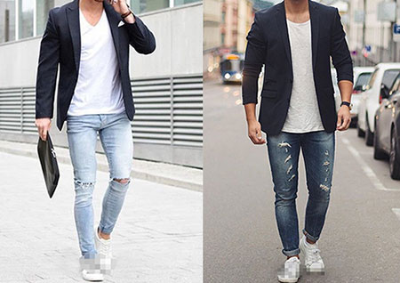 西裝外套搭配牛仔褲明顯休閑感更甚,不過(guò)西裝的款式需要注意,應(yīng)該以短款為主,因?yàn)榇钆渑W醒潱晕餮b顏色可以不需要那么講究,但萊特小編不建議內(nèi)搭襯衫,反而內(nèi)搭T恤更符合牛仔褲的隨性不羈。