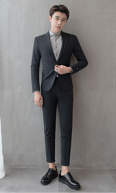 對于這類矮瘦型男士,西裝款式上可以選擇帶有衩口的兩粒扣西裝,這樣會有一種視覺上的延伸感。在衣長上,西裝下擺的長度在盤骨位稍下一點即可,這個位置可以很好的將上半身調整到最佳比例。顏色選擇不能過于花亂,否則很容易將缺點放大。可選純色、暗條紋、小格子,切記不要選擇大寬條紋,否則會顯得身型會更加單薄。
