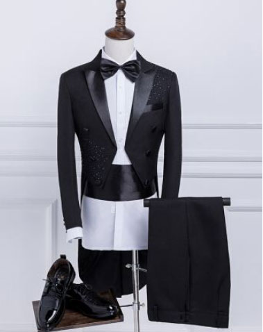 燕尾服(晚間大禮服)的特點(diǎn)是:鑲鍛槍駁領(lǐng),雙排扣,前端是折角短下擺,也就是前短后長帶個(gè)尾巴,總衣長近膝。必須配側(cè)鑲嵌雙條鍛帶的長褲,馬甲,白色領(lǐng)結(jié)。