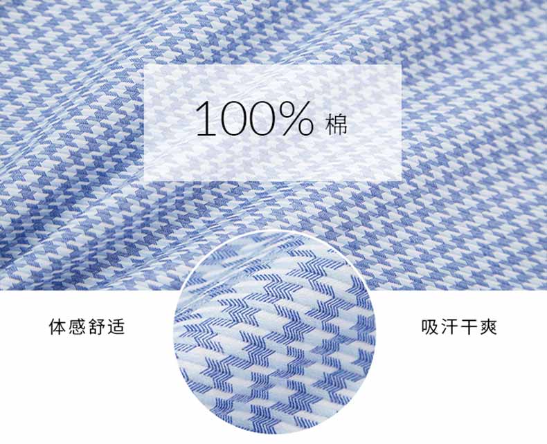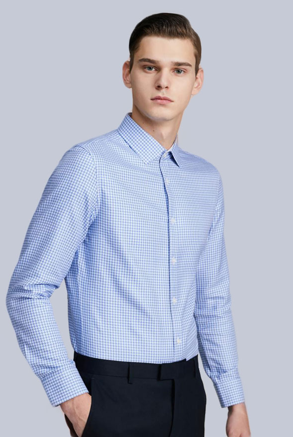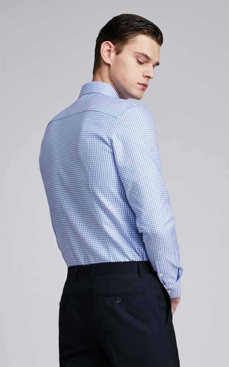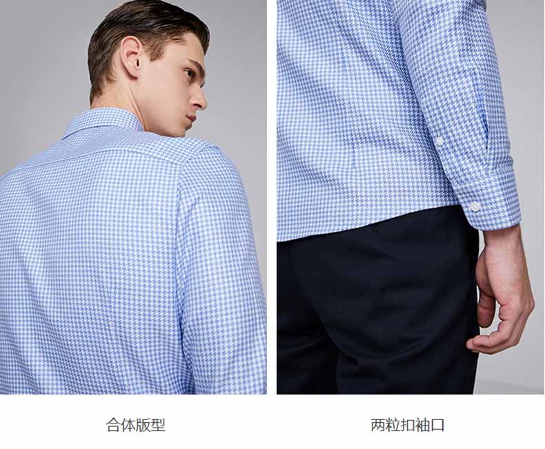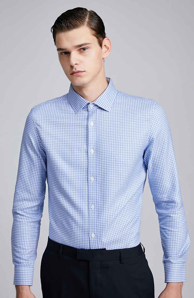藍(lán)色千鳥(niǎo)格圖案,賦予商務(wù)男士穿搭以雅致清爽的感覺(jué).內(nèi)搭以及外穿都適宜.是一款比較受年輕男士追捧的襯衫款式.