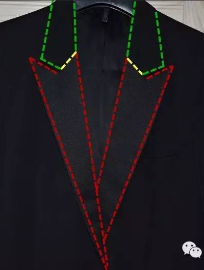 平駁領:平駁領英文名叫Notched Lapel,直譯為“有缺口的翻領”。平駁領通常是屬于鈍領的一種,其領子的下半片和上半片通常有一個夾角。如下圖,紅色虛線內區域為駁頭(Lapel),綠色虛線內為翻領(Collar),在黃線處二者縫合在一起,并形成一個V字缺口,這個V字缺口就是平駁領的關鍵特征。