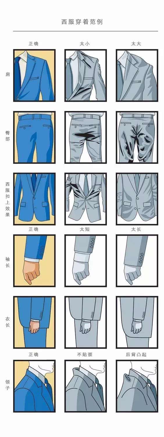 因此,西裝最重要的就是合體,不合體的西裝帶給你的只有缺乏品位和不專業。因此一套合適的西裝應該如下圖所示: