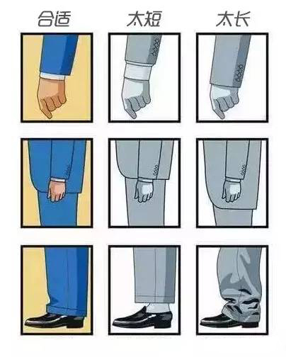 七忌,西服上衣袖子過長,應比襯衫袖短1厘米;